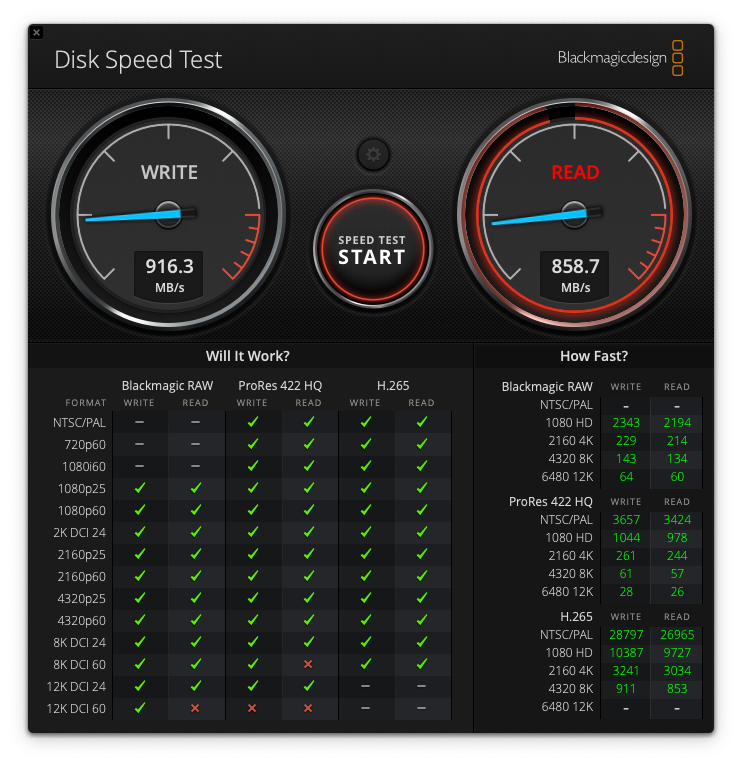 외장 디스크 속도: 쓰기 916MB/s, 읽기 858MB/s