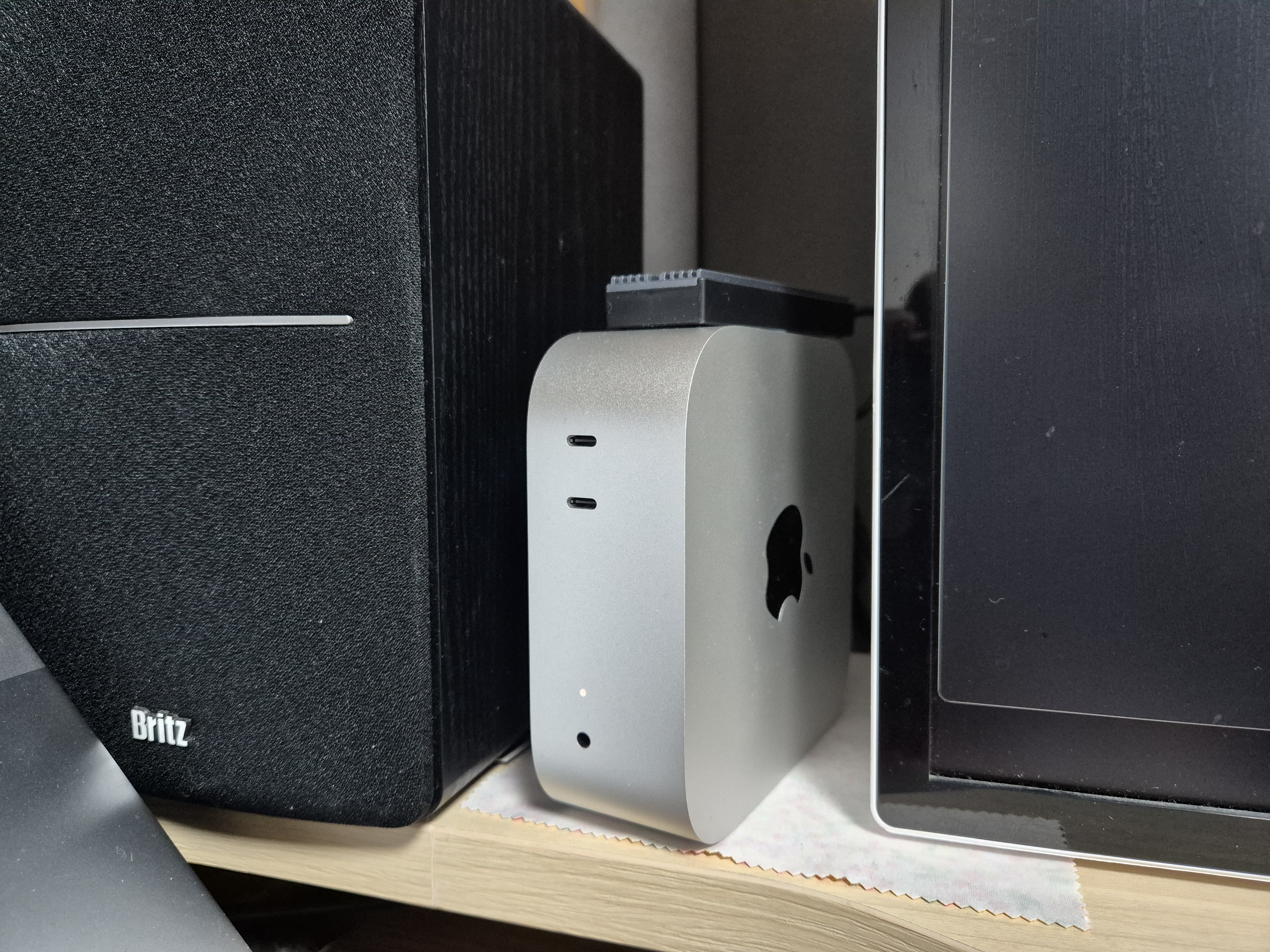 기존에 사용하던 m1 맥미니는 전원버튼이 뒤에 있어서 그나마 누를수가 있었는데, 이번거는 전원버튼이 아래에 있으니 눞혀놓고는 쓸수가 없다. 보기엔 별로 안 좋지만 그냥 세워두고 그 위에 외장 SSD 를 특수 접착물체(?)로 붙여놨다. ㅡ.ㅡ; 알리에서 몇가지 받침대를 팔고 있던데 마음에 쏙드는건 없음.