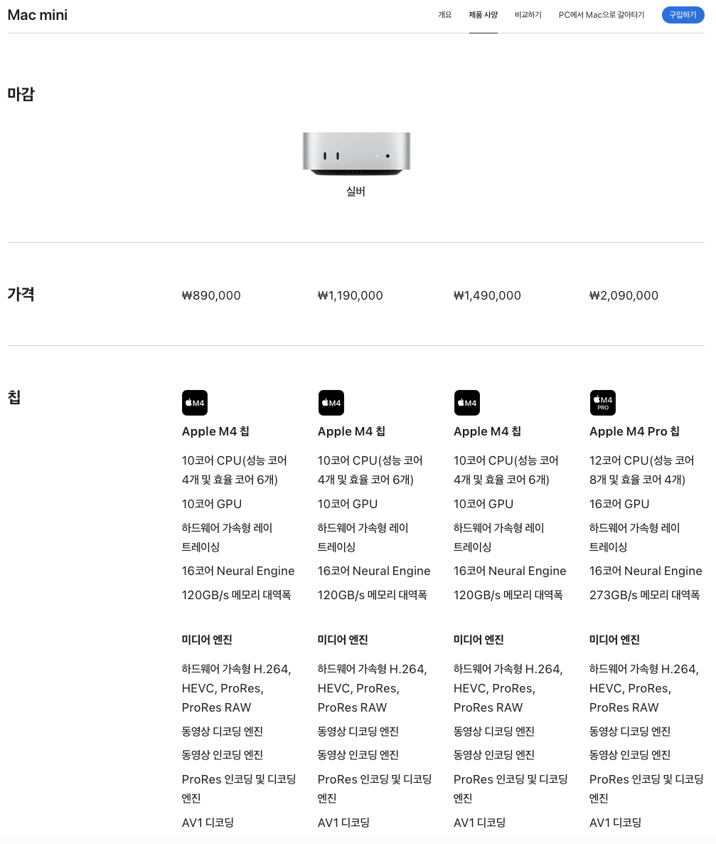 스펙 링크: https://www.apple.com/kr/mac-mini/specs/ (새모델 나오면 없어질테니 스샷 몇장 찍어서 남겨둠)